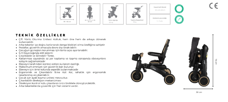 Direksiyon kontrol kolu çıkarılarak ürün bisiklete dönüştürülebilir.