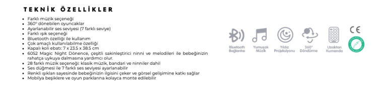 6052 Magic Night Dönence, çeşitli sakinleştirici ninni ve melodileri ile bebeğinizin rahatça uykuya dalmasına yardımcı olur.