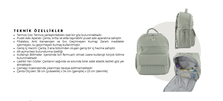 Puset Askı Aparatı: Çanta, sırtta ve elde taşınabilir puset askı aparatına sahiptir.